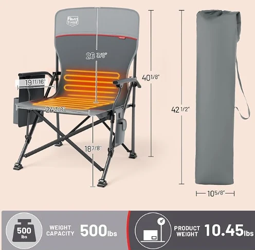 Ogrevani zložljivi stol po meri, dvojne ogrevalne cone za hrbet in sedež segrejejo do 131 ° F v samo 10 sekundah. Tri toplotne nastavitve (104 ° F, 122 ° F, 131 ° F) zagotavljajo toplino za katero koli zunanjo priložnost (baterija ni vključena).
