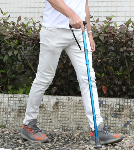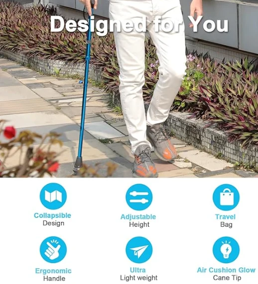 Zložljivi teleskopski sprehajalni trs, konica se ponoči prižge, kar močno zagotavlja varnost nočne hoje. (Z izpostavljenostjo v svetlobi za določen čas, žareči stožec pride do vidljivosti v temi.