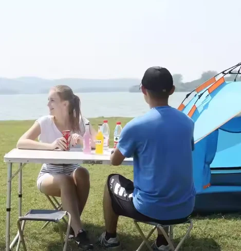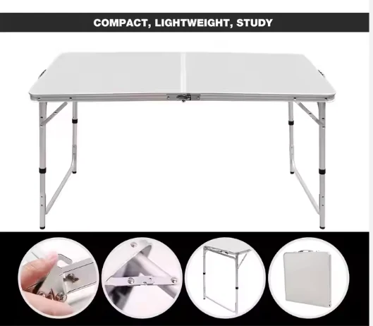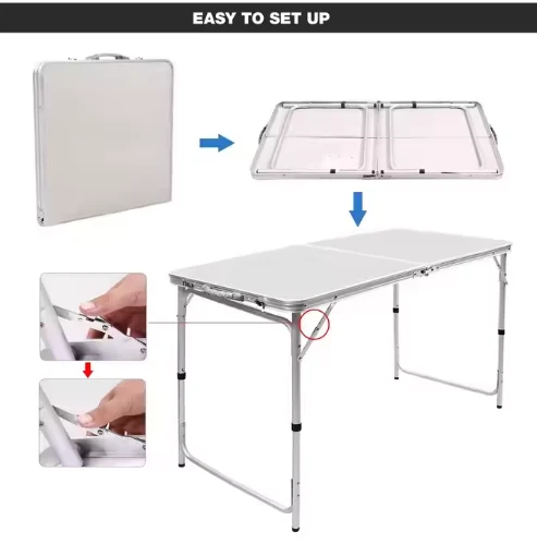 Prenosna zložljiva aluminijasta miza, ima večnamensko uporabo, tako v zaprtih prostorih kot na prostem, vključno z mizo za piknik, mizo na plaži in kuhinjsko mizo za kampiranje, ki se uporabljajo za kampiranje, plažo, turizem, športne prireditve, RV zunaj in ribolov.